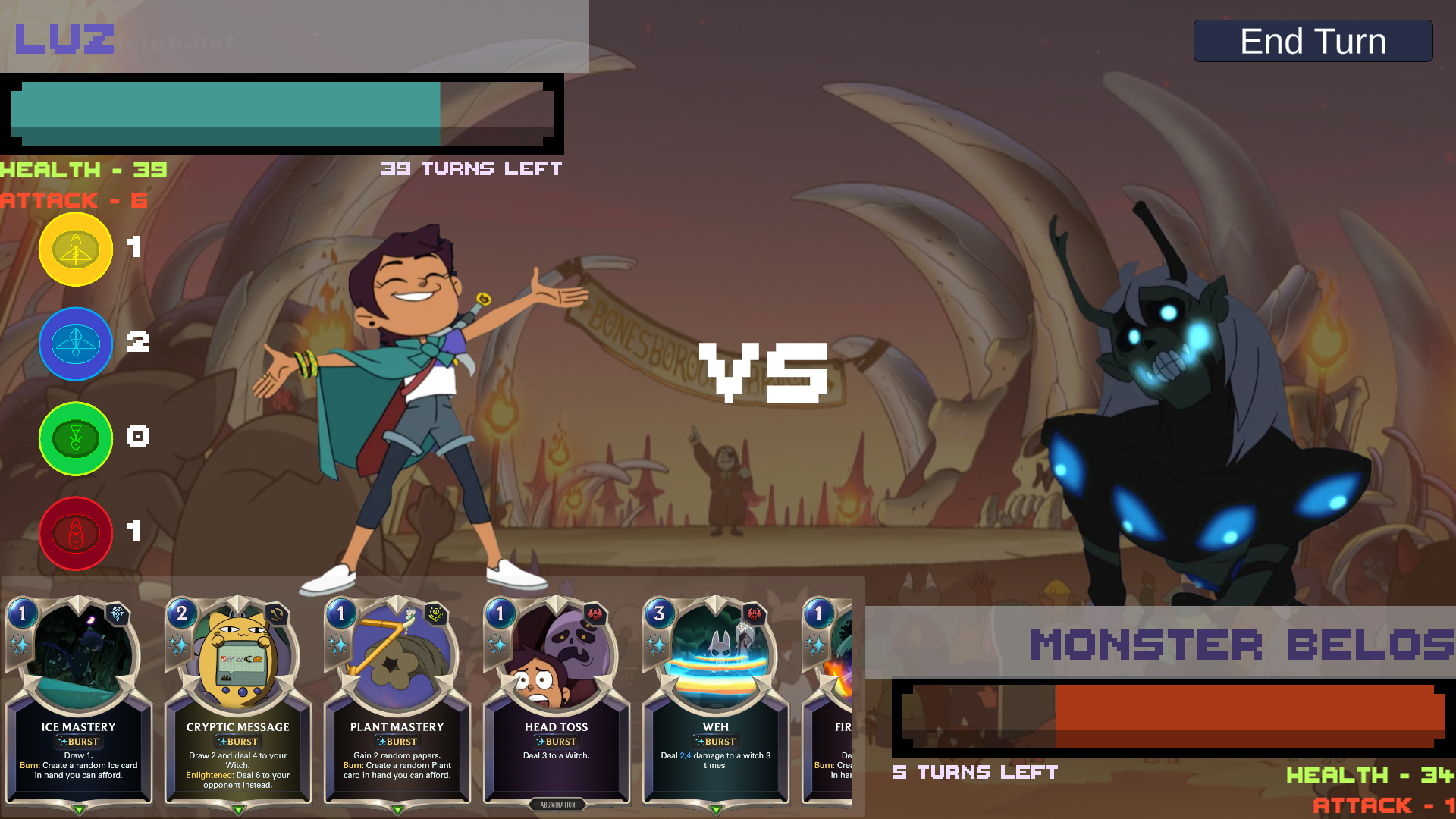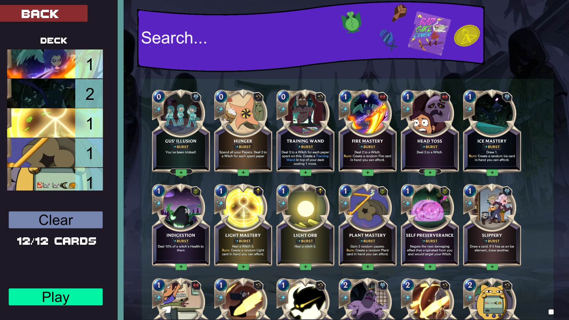 Master the 4 elements, dabble in Wild Magic, and battle iconic witches in this fast-paced card game inspired by The Owl House. Every spell and character has effects and powers to match their power in the show.